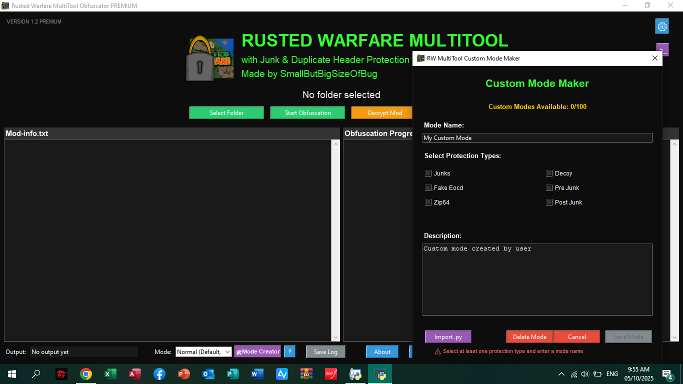 6. Python Obfuscation Modes Importer - Import custom written encryption/obfuscation python file into the app itself to be used as a custom mode.